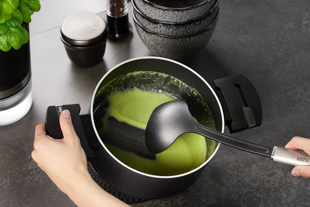 De Gefu soeplepel Primeline laat geen krassen achter in potten, pannen of kommen. De soeplepel is geschikt voor het portioneren van muffin-, wafel- of pannenkoekbeslag, maar ook voor het opscheppen van soepen en sauzen. De soeplepel is hittebestendig tot 210 °C en heeft een vulinhoud van 100 ml. De Gefu Soeplepel Primeline is gemaakt van nylon en heeft een lengte van 33.5 cm.